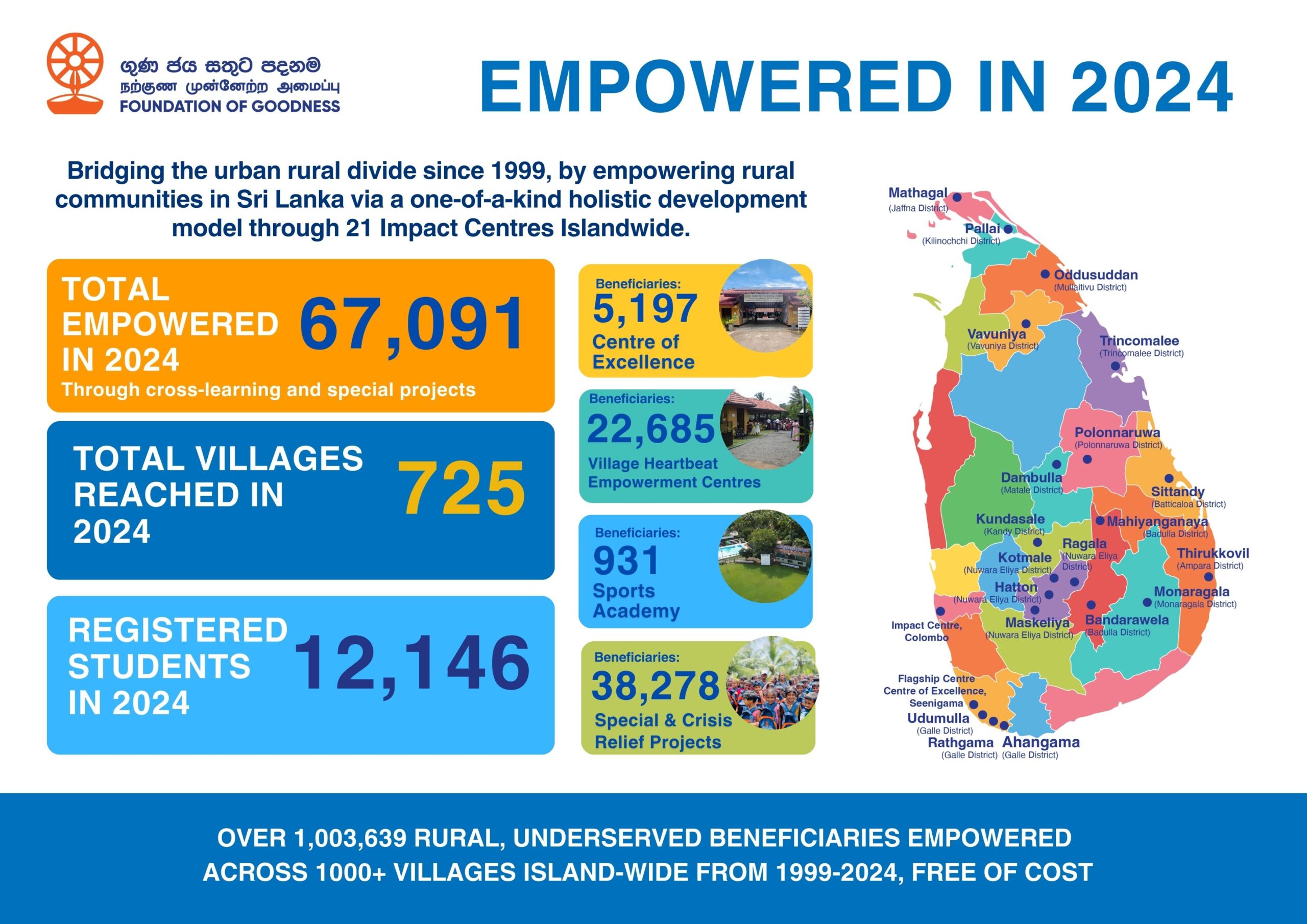 Despite struggles brought on by the Tsunami in 2004,, Covid 19, and the Sri Lankan Economic Crisis, the Foundation of Goodness was able to deliver a wide range of programmes to over 1,000,000 beneficiaries from 1000+ villages across Sri Lanka, free of charge.